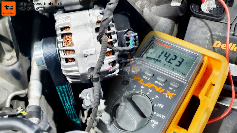 시동을 걸고 충전 전압을 체크해주니 정상치가 나오네요..