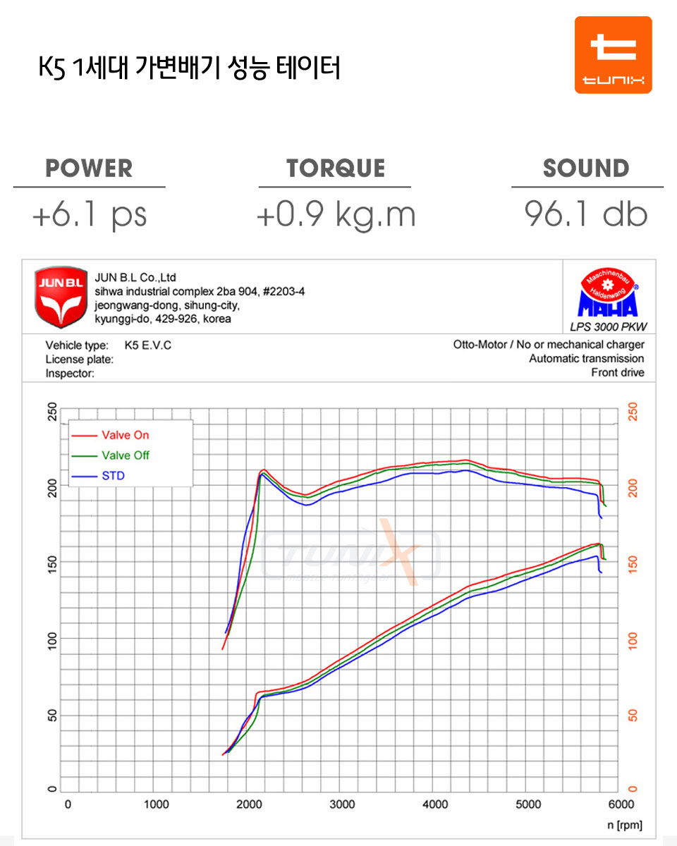 최고점은 6.1마력 상승,토크는 0.9kg.m 상승하였고, 전 구간에서 순정에 비해 고른 상승을 하였다.