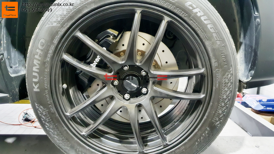 브레이크는 만도4p 355mm경량디스크 조합으로 튜닝된상태입니다