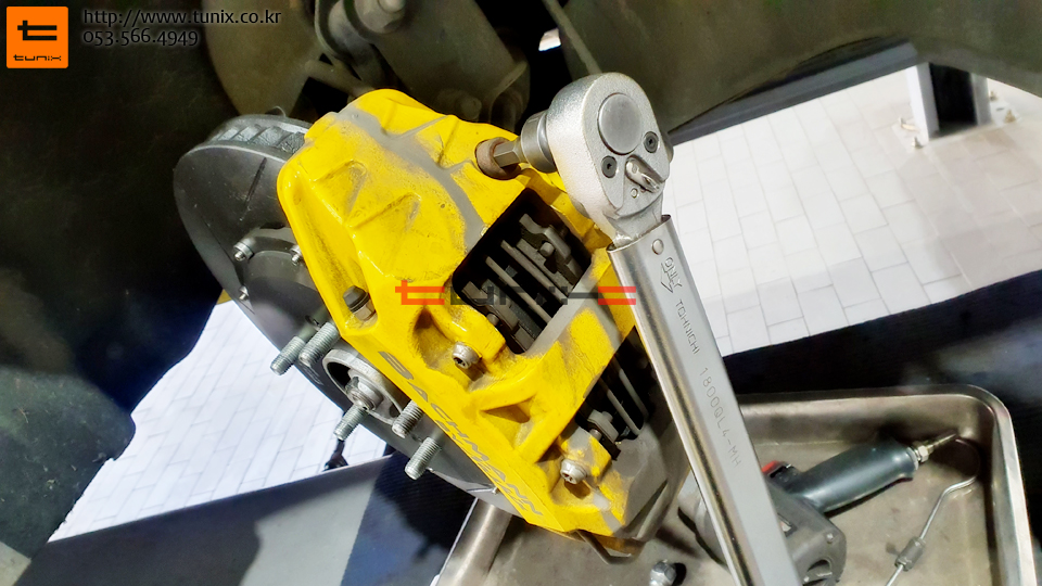 캘리퍼는 볼트본트와 토크렌치를 사용하여 꼼꼼히 장착해줍니다