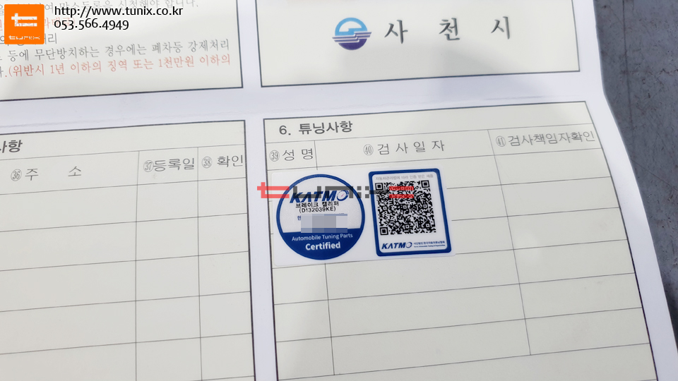 튜닝인증스티커를 사진처럼 차량등록증에 붙이고