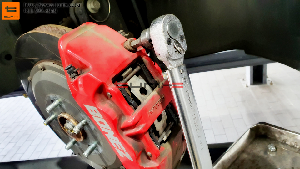 패드교체를 마치고 토크렌치를 사용하여 꼼꼼히 캘리퍼 재장착해줍니다