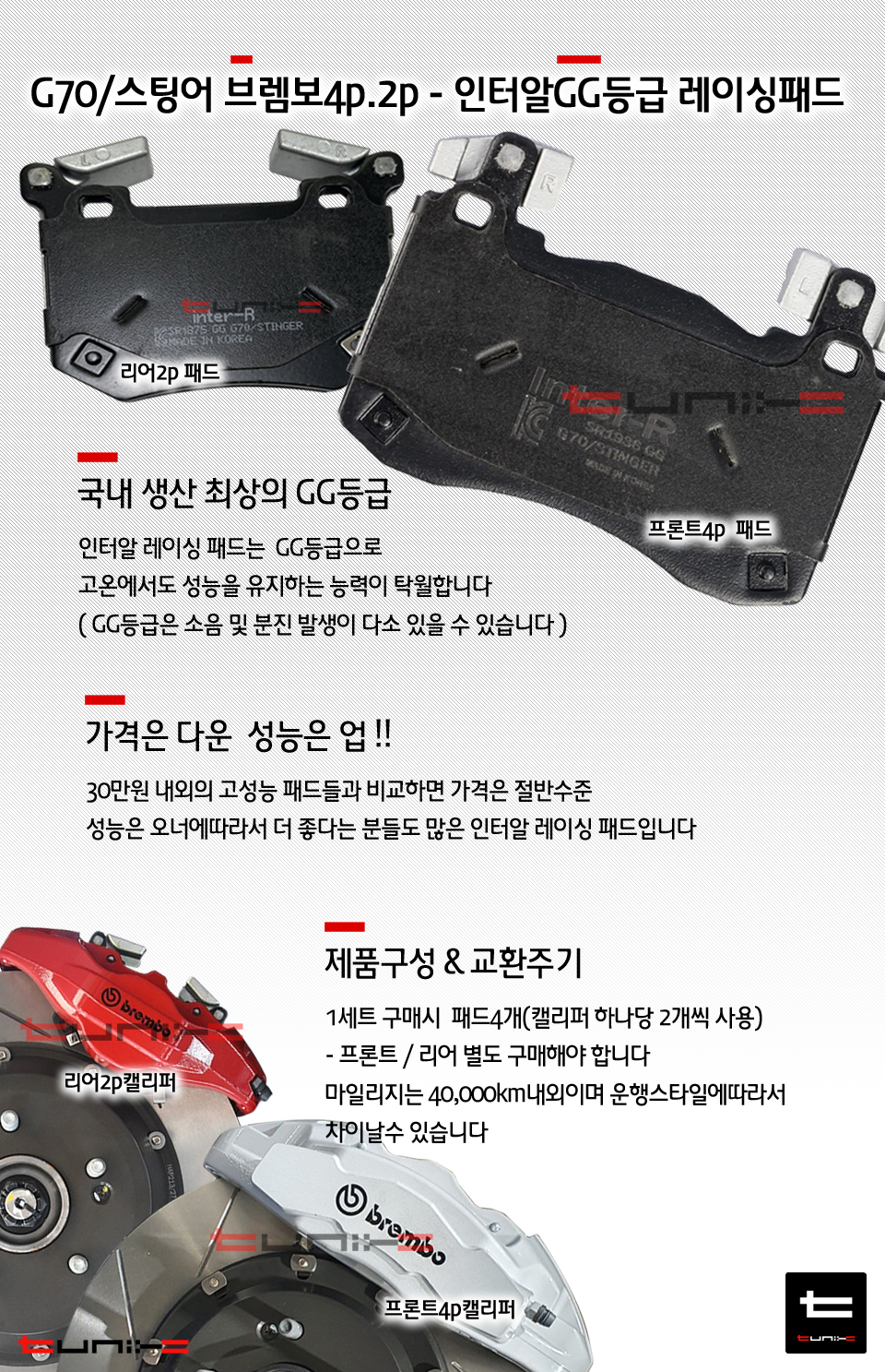 G70 스팅어 브렘보4p 리어2p 인터알 레이싱패드 GG등급 : 튜닉스-TUNIX