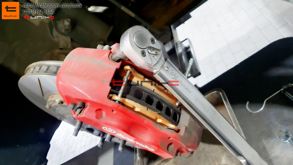 토크렌치와 볼트본드를 사용하여 꼼꼼히 캘리퍼를 재장착해줍니다