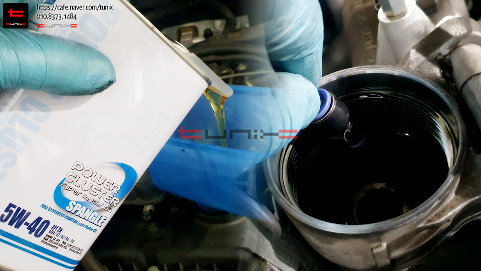 오일은 합리적가격의 고성능 파워클러스터 스팽글 5W40으로 진행하였습니다