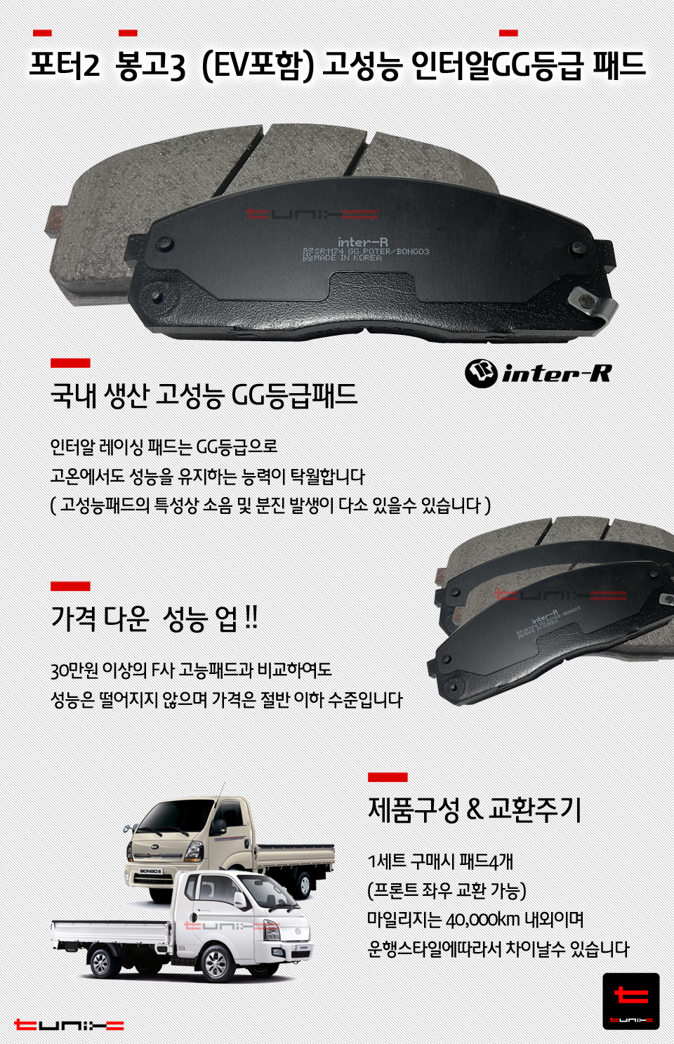 포터2 봉고3 EV가능 캠핑카 인터알 레이싱 GG등급 브레이크패드 : 튜닉스-TUNIX