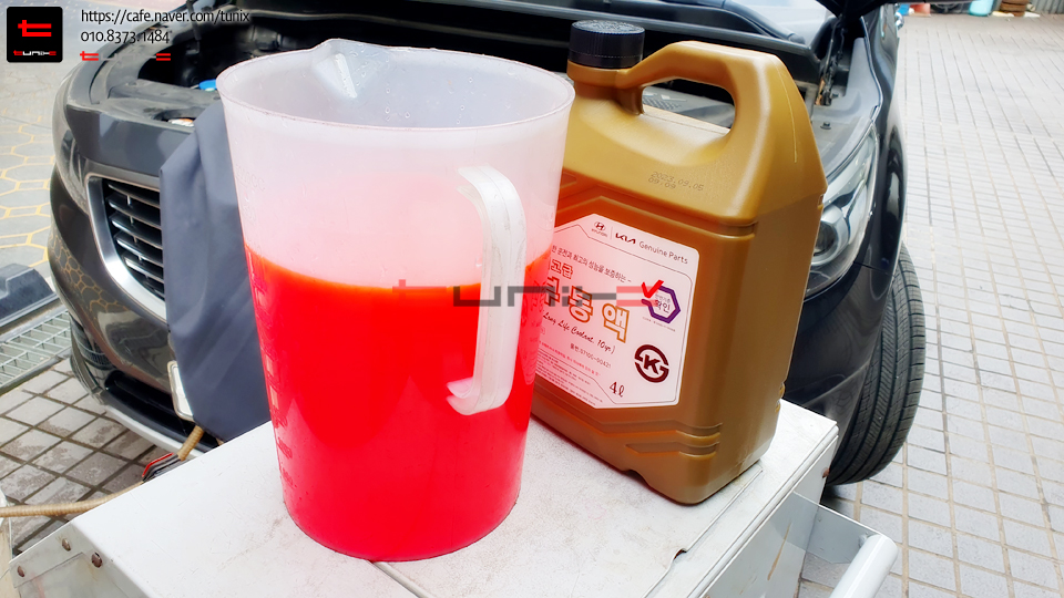 순정 핑크색 최고급부동액을 비중에 맞게 넣어줍니다