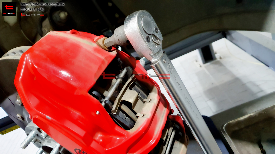 캘리퍼는 토크렌치와 볼트본드를 사용하여 꼼꼼히 장착해줍니다