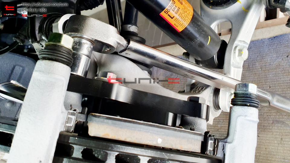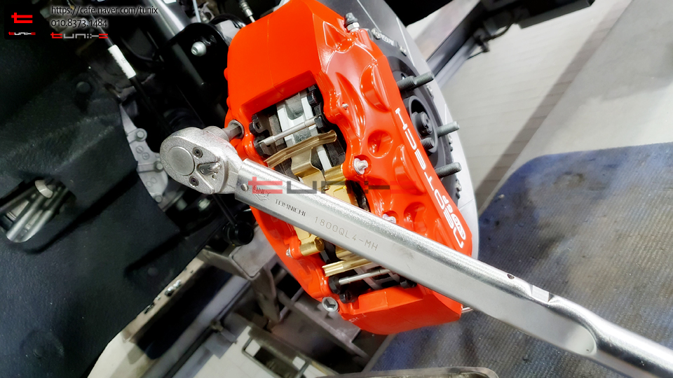 캘리퍼와 브라켓을 볼트본드 토크렌치를 사용하여 꼼꼼히 장착해줍니다