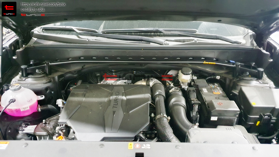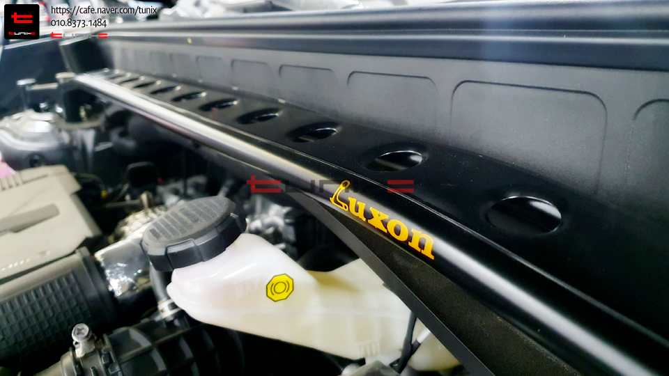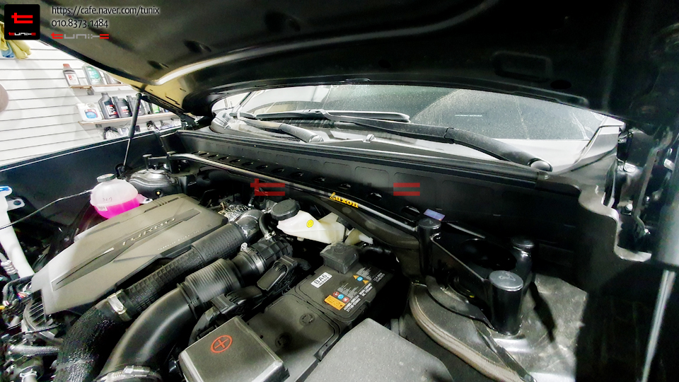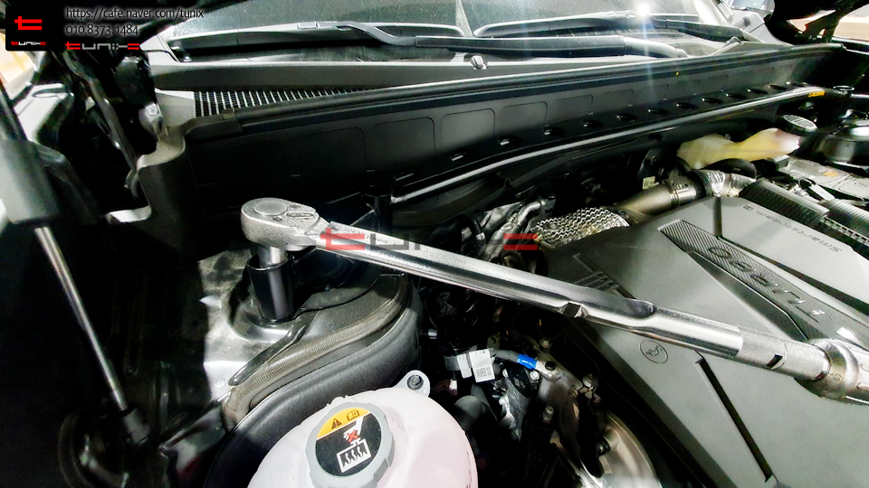 엔진룸에 룩손스트럿바를 토크렌치를 사용하여 꼼꼼히 장착해줍니다